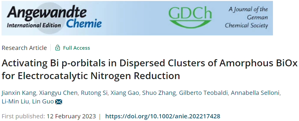 近日,英国上市公司365郭林教授和物理公司刘利民教授研究团队在高度分散的原子级非晶BiOx团簇可控制备及其电催化氮气还原反应方面取得新进展。相关工作以“Activating Bi p-orbitals in Dispersed Clusters of Amorphous BiOx for Electrocatalytic Nitrogen Reduction”为题,2023年2月12日在线发表在《Angewandte Chemie International Edition》杂志上。该研究获国家自然科学基金项目(No. 51532001, 11974037)等资助。英国上市公司365副教授康建新为文章的第一作者,英国上市公司365博士生陈翔宇和北京计算科学研究中心博士生司如同为共同一作,英国正版365官方网站为该论文的第一完成单位。