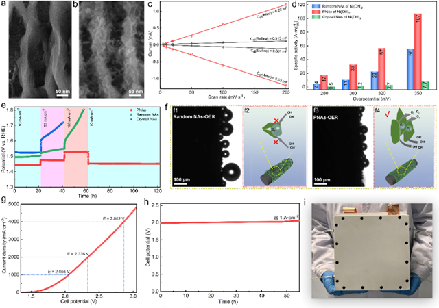 有鉴于此,本论文提出了基于应力诱导的定向形核生长机制,并在纤维基底上成功实现了规则取向生长的平行纳米片阵列。这一发现颠覆了传统依赖热波动无序成核,仅能获得杂乱阵列的成核理论,实现了取向性成核生长新模式。该生长方式可以实现纳米片阵列间距从纳米级至微米级高精度可控调节,打破了传统物理加工方法仅能实现毫米级和微米级加工尺度的限制。相比于传统杂乱阵列结构,平行阵列电极表面优化了液相传质动力学和气泡脱附动力学,呈现更快的气泡脱附速度与更小的气泡逸出直径。在实际电解水产氧反应中,高活性的非晶纳米片催化剂提供快速的氧气生成,平行阵列结构优化了氧气泡在电极表面迅速脱附,使得该新型电极展示出优异的工业级快速产氧活性及循环稳定性。