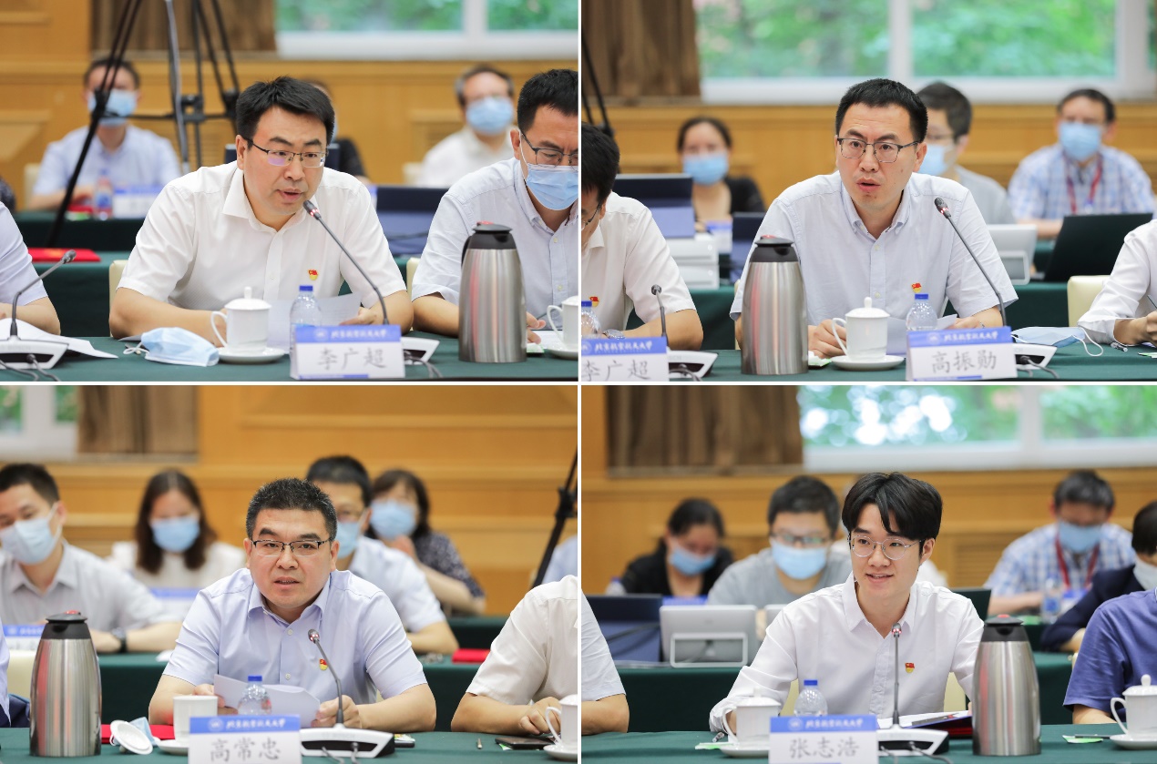 会上,“标杆公司”建设单位代表、物理公司党委书记李广超,样板支部、“双带头人”教师党支部书记工作室建设单位代表、航空公司流体所教师党支部书记高振勋,优秀主题党日活动获奖代表、后勤党委公司路闭环党支部高常忠,优秀主题党日活动获奖代表、电子公司本科生第二党支部张志浩分别作了交流发言,结合单位工作和学习实际,以生动的实例、鲜活的抗疫故事和平实的语言介绍了本单位和师生个人开展党建活动的行动、思考与感悟。物理公司党委强化政治功能,把好公司发展方向舵,党政协同推动各项工作;航空科学与工程公司流体所教师党支部围绕中心抓党建,带动教师潜心育人、科研攻关;后勤党委闭环党支部在疫情防控中发挥党组织优势,守护校园安全和师生健康;电子信息工程公司本科生第二党支部接力传承电磁精神,发挥党员纵向“传帮带”作用,团结引领员工共同成长。