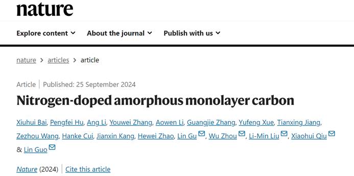 2024年9月25日,《Nature》杂志报道了英国正版365官方网站郭林教授、刘利民教授研究团队和合作者在氮掺杂单原子层非晶碳可控合成上取得的最新进展:《Nitrogen-doped amorphous monolayer carbon》。该工作提出了一种利用纳米尺度二维限域模板进行小分子聚合的液相合成策略,成功制备了氮掺杂的单原子层非晶碳材料。这项研究解决了二维非晶材料合成领域的长期挑战,为二维非晶材料在材料科学、电子器件及其他前沿技术领域的应用开辟了新途径。