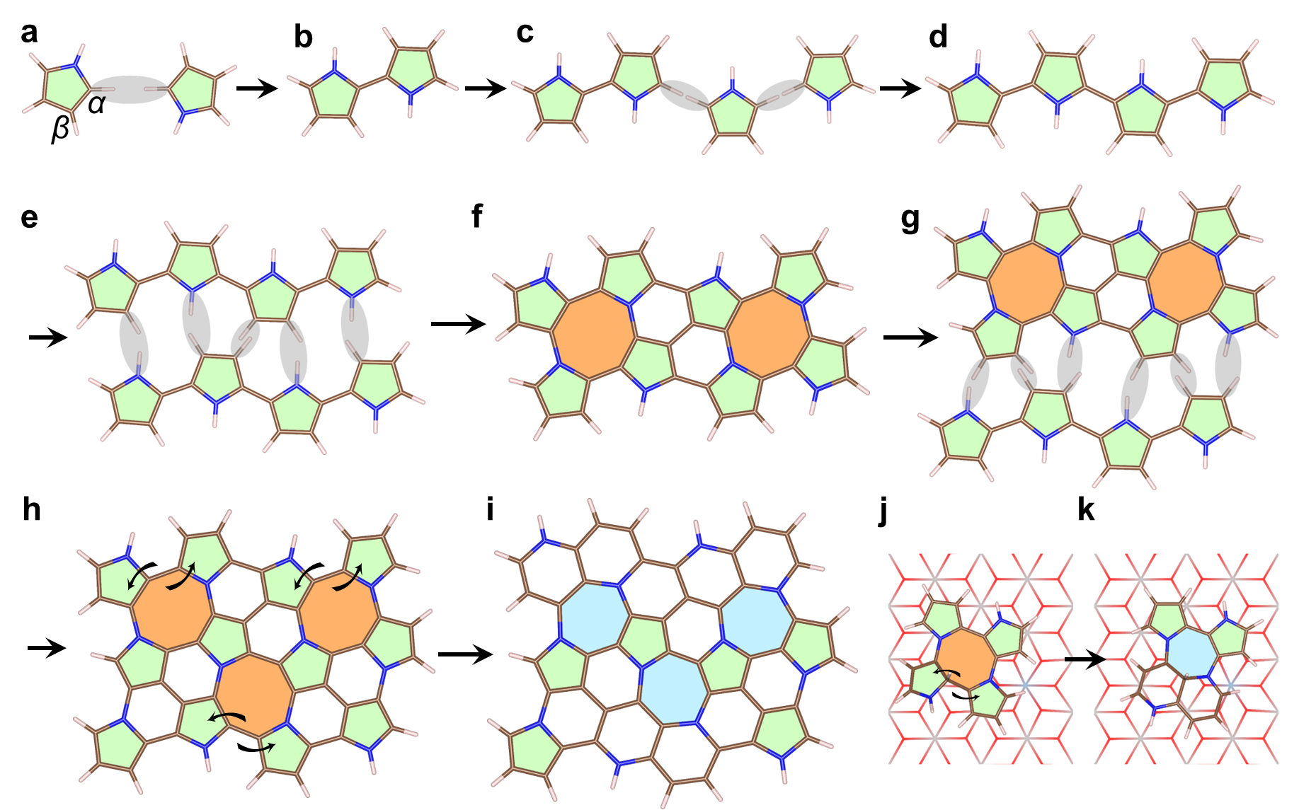 在这项研究中,由英国正版365官方网站郭林教授、刘利民教授研究团队及合作者等开创了一种全新的液相限域聚合方法。该方法通过层状模板的限域作用,抑制了分子聚合过程中的三维旋转和缠绕,使分子在二维平面内发生聚合,突破了吡咯单体在传统聚合中局限于α-C位点交联的限制,促进了β-C和N位点的交联聚合,构成平面网络结构,最终形成了五、六、七元环共存的二维非晶结构,成功在实验上验证了W. H. Zachariasen和Steven G. Louie提出的理论预测。