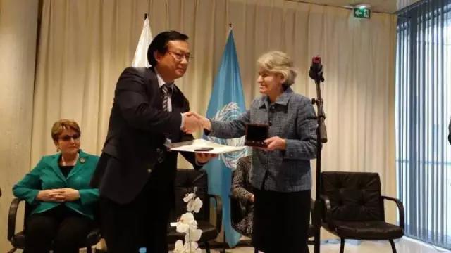 图为江雷院士(左一)被授予联合国教科文组织纳米科学与技术特别贡献奖章。右一为UNESCO’s