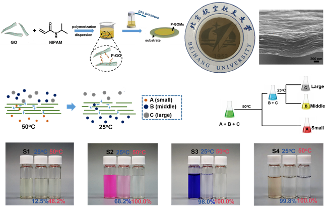 膜分离作为选择性分离领域的一种手段,在工业生产和日常生活中起着不可替代的作用。近年来,快速的城市化和工业化进程,工业污水的肆意排放和洁净生活饮用水的匮乏,让持续枯竭的淡水资源的形势变得愈发严峻。以分离膜技术为代表的解决方案,引起了广泛地关注和重视。公司英国上市公司365赵勇教授、王女副教授课题组近年来在高效液体分离膜领域取得一系列进展:使用静电纺丝技术结合其它合成手段制备了浸润性可调的纳米纤维膜,可用于高效油污吸附分离(Nanoscale2015,7, 2625);利用二元协同互补理念制备了大通量连续化油水分离器(J.Mater. Chem. A, 2016,4, 4365);使用静电纺丝技术及水热合成的方法,仿生制备了具有树枝状多级结构的无机纤维膜,可实现高效乳液的分离(J.Mater. Chem. A, 2016, 4, 12014;J.Mater. Chem. A, 2017, 5, 16134);通过构筑具有多尺度结构网膜并精确调节其表面能,实现了基于有机液体表面张力差异的非水体系混合有机液体分离(NPGAsia Mater.2016, 8, e334;Small,2017, 13, 4)。在前期多相液体分离膜工作的基础上,赵勇教授、王女副教授课题组进一步制备了具有仿生温度响应的石墨烯分离膜用于水门控及混合分子分离。在之前研究中,氧化石墨烯分离膜的孔径无法实现简单的原位调控,从而限制了其应用。该工作从自然界中获得灵感,模仿植物(如仙人掌)叶片在高温下气孔关闭调节水蒸发通量从而维持生命这一功能特性,仿生构筑了“高温闭孔,低温开孔”的氧化石墨烯膜。作者通过自由基聚合反应将温敏性高分子聚(N-异丙基丙烯酰胺)与氧化石墨烯共价连接,制备了孔径可受温度原位调控的氧化石墨烯分离膜。该分离膜在纳滤尺度上表现出优异的性质,并且通过其温度响应性质可实现不同尺寸混合分子的梯度分离。此研究拓展了智能响应分离膜的应用领域,为水净化、精细化工分离等提供了新的处理思路,同时该膜在微流控及智能反应器领域均有着潜在的应用。
