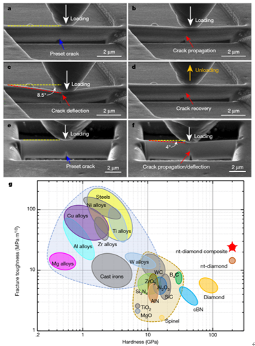 上图为:纳米孪晶复合金刚石及纯孪晶相金刚石材料的原位弯曲变形过程及与其他工程材料硬度和断裂韧性的比较。 |