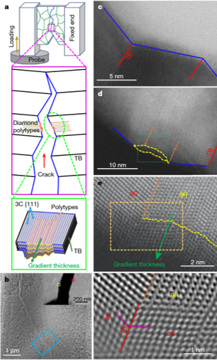 研究者利用搭建的扫描电镜原位力学测试设备,采用原位单边切口梁弯曲实验方法系统研究了纳米孪晶金刚石的断裂行为,测得的断裂韧性高达26.6 MPa m1/2,是合成金刚石材料断裂韧性的5倍以上(见下图)。为了进一步揭示材料高断裂韧性的起源,研究者利用透射电镜下的原位力学实验研究了纳米孪晶复合金刚石材料裂纹的扩展机制。实验发现在高密度孪晶区,裂纹沿着{111}面扩展并在孪晶界处迅速改变方向,形成“之”字形路径;当裂纹遇到非立方相多型结构时,{111}面不再连续,裂纹扩展路径变得弯曲和起伏;当裂纹穿过非3C相金刚石多型结构后,非3C相金刚石会发生向3C相金刚石的转变(见文末图);上述几个方面协同作用极大地耗散了能量,使材料的断裂韧性显著提高。