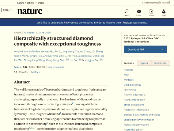 2020年6月18日,Nature杂志在线全文发表了公司郭林教授、岳永海教授团队与燕山大学田永君院士团队在纳米孪晶复合金刚石增韧机制方面的最新研究成果:“Hierarchically structured diamond composite with exceptional toughness”。岳永海教授、高宇飞博士、胡文涛教授、徐波教授为文章共同第一作者,周向峰教授、郭林教授、田永君院士为共同通讯作者。