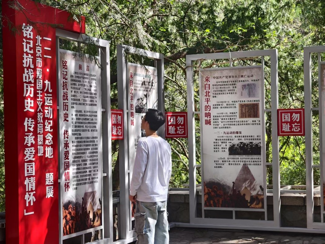 支部党员沿樱桃沟步道攀登至纪念地。行至半途,“勿忘国耻,圆梦中华”的鲜红标语赫然映入眼帘,字字铿锵有力,仿佛跨越时空的呐喊,将抗战精神与新时代青年使命紧密相连。在庄严肃穆的“一二·九运动纪念亭”前,支部书记陈喆为支部党员讲述了“一二·九”运动时期的革命历史和意义。同学们结合展板图文,深刻学习了“一二·九”运动中爱国员工冲破封锁、唤起民众觉醒的历史细节。同学们长久驻足,透过泛黄的历史照片和详实文献,追忆北平员工抗日救国示威游行的壮烈场景。党员王力宏感慨:“题展里郭明秋等革命前辈组织领导爱国员工运动的事迹,让我深刻体会到战争年代,青年学子抛头颅洒热血;当代青年与新时代同向同行,肩负民族复兴重任,我们应牢记嘱托实干笃行,牢记科技强国使命。”党支部书记陈喆表示:“作为理工科研究生,我们既要传承‘科学救国’的历史基因,更要培育‘科技报国’的时代担当。”