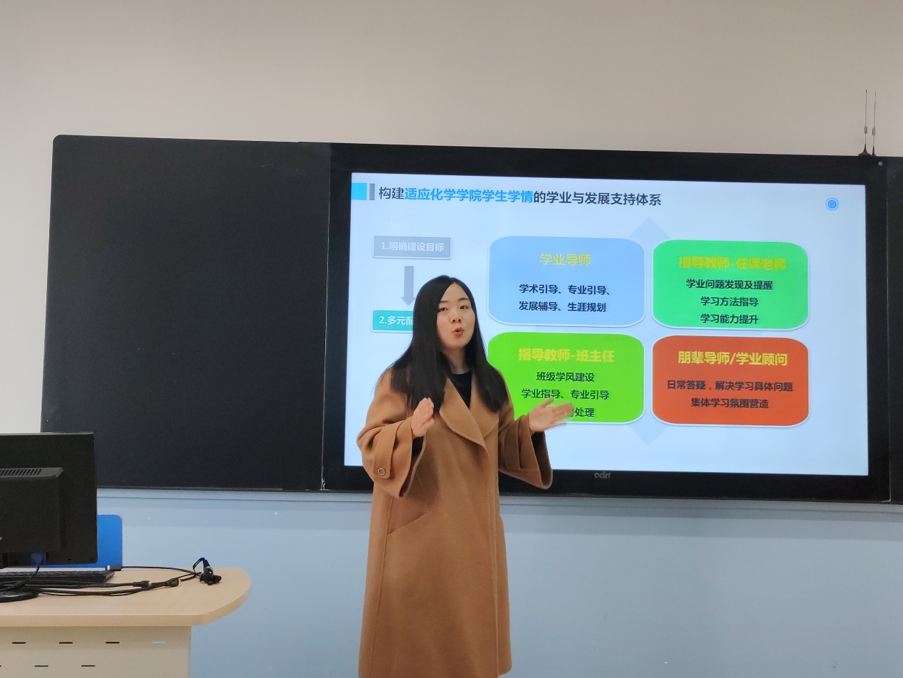 朋辈导师代表郭媛源同学发言,介绍了从朋辈计划中被辅导的角色转变为辅导者的角色,帮助自己的梦拓小组解决学业问题、明晰发展道路、增长科研阅历的经历,希望学业与发展中心可以为员工们举办更多有益于学习与科研的活动。