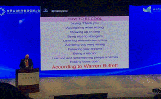 2007年诺贝尔经济学奖获得者Eric Maskin先生以“医学研究成果应该授予专利吗?”为题,向大家展示了科技与生活,科技与社会的重要关系,引发了大家的思考。2016年诺贝尔物理学奖获得者Duncan Haldane先生从自己的求学经历以及与导师相处关系为实例发表了关于科学与教育的讲话。其中教授关于如何与导师积极沟通交流以及中学化学老师重要性的观点很值得我们学习。克隆之父Ian Wilmut,一生都在为科研奋斗,在给嘉宾及员工代表讲述从克隆羊多利到个性化治疗的主题演讲在讲到多利时就像在讨论自己的孩子饱含深情,这一点深深打动了我们。褚君浩院士发表了科技创新开拓智能时代这一有深度的演讲,不仅阐述了当下科研工作的现状还为未来科研的发展指明了方向,并对新一代青年提出了勇于担责不断创新的要求。2014年诺贝尔物理学奖获得者中村修二发表了主题为蓝光LED的发明与未来半导体照明的演讲,不仅全面形象的论述了当下蓝光LED面临的问题以及给人类带来的危机,还给提出了未来半导体照明发展方向。褚君浩院士发表了科学进步与科学共同体的责任的主旨演讲,提出让科学伦理建设与科学创新齐头并进的观点。2016年诺贝尔化学奖获得者James Fraser StoddartJames就创新驱动领先的科学研究的主题进行演讲,强调要鼓励青年人创新,做自己喜欢并享受的事(DONE YOUR OWN THING),让同学们重新审视自己的人生,最后还给同学们一些当代处世的建议。这些都令我们受益良多。参加此次会议不仅能近距离的与诺奖获得者接触还给同学们带来了很多感触,真切的感受到优秀的科学家对待科研真理的严谨的负责的态度以及勇于承担社会责任为科研奉献的精神。2010年诺贝尔物理学奖获得者konstantin关于未来的材料发表了主题演讲,激发了同学们对未来材料的兴趣。