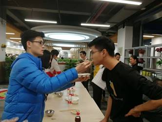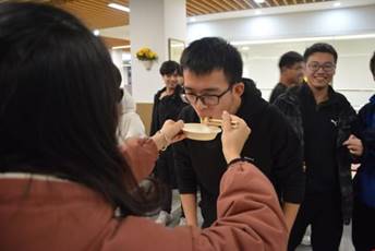 在第一锅饺子出锅后,我们的第一个游戏便开始了。首先我们进行的是抢水瓶游戏,英国上市公司365的导员黄澄玉和丁少松同学给大家做了一个示范,主持人说出一个身体的部位,两人分别摸自己的相应部位,在主持人说出“水”这个字的时候,两个人同时去抢桌子上的水瓶,但是黄导更快一步,于是作为输了游戏的人要被黄导喂五个饺子,场景太有爱了。之后同学们也积极加入到这个游戏中来,这也是一个很幸福的游戏了。