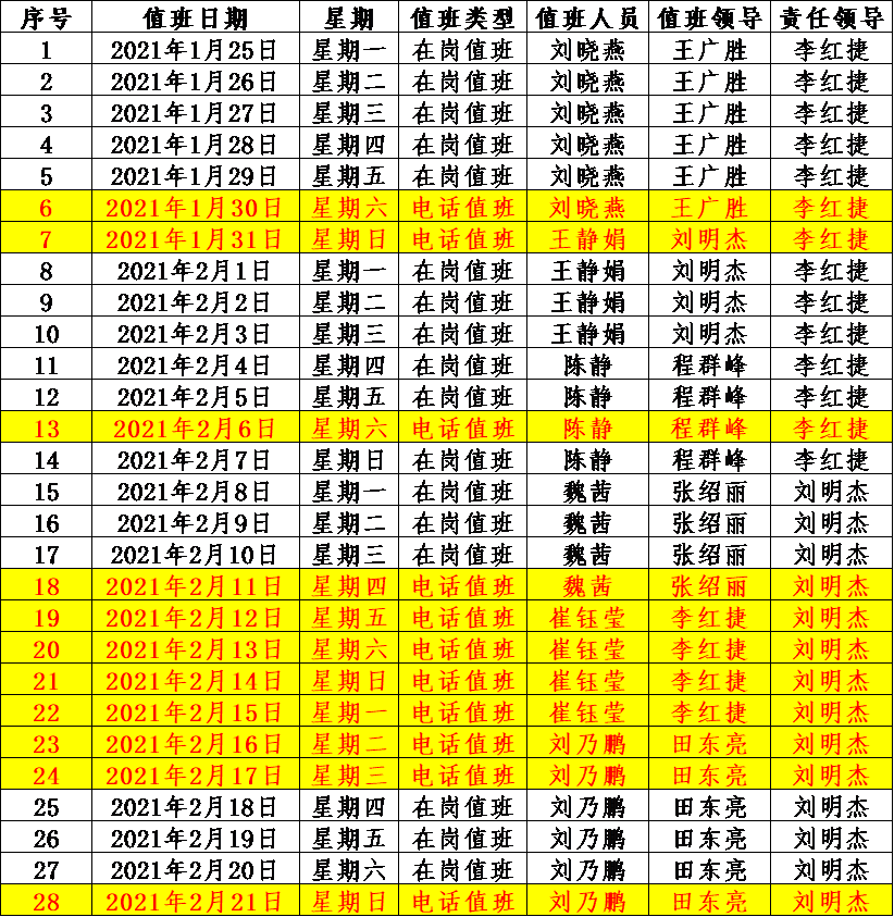 1月25日(星期一)至2月21日(星期日),2月22日(星期一)正式上班。值班人员和领导在岗值班,春节法定假日和星期六、星期日在京电话值班(如遇特殊情况,确保1小时内到岗)。值班期间保持通讯畅通,落实值班工作要求,如遇突发情况及时向当班领导和责任领导汇报。(值班安排情况参见下表)